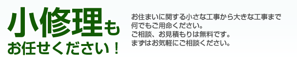 内装リフォーム・店舗改装・原状回復工事・外壁塗装・屋根修理・建具修理・フローリング工事・シロアリ工事・網戸張替・パッキン交換・ルームクリーニング・消毒・定期巡回清掃など
