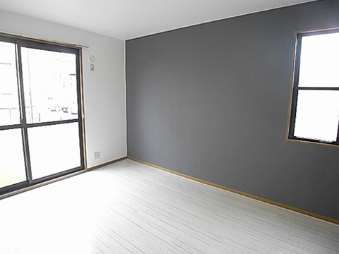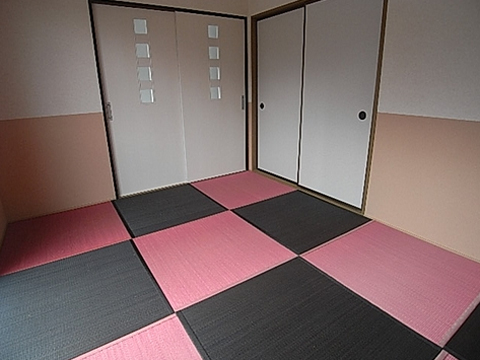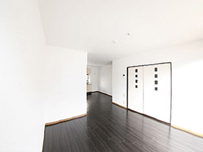 リビングのフローリングは黒で高級感を出し、洋室は白い床と一面だけのデザインクロスで仕上げています。 和室はカラー畳を使用し、クロスは上下ツートンカラーで仕上げています。